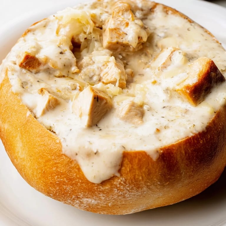Save to Pinterest My neighbor knocked on my door one rainy Tuesday holding four sourdough boules and a guilty grin. She'd accidentally bought extras for her book club, and I'd just texted her about craving comfort food. Within an hour, my kitchen smelled like butter and garlic, and I was spooning hot chicken Alfredo into hollowed-out bread bowls, wondering why I'd never thought of this before. That spontaneous dinner turned into one of those meals you replicate over and over, tweaking it each time until it feels like yours.