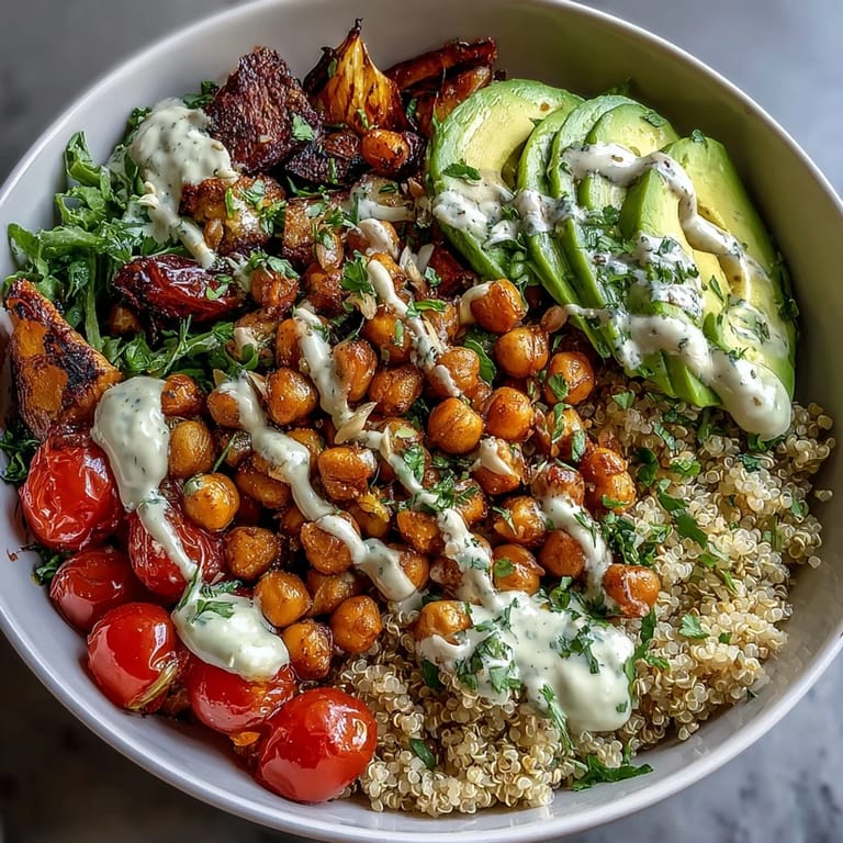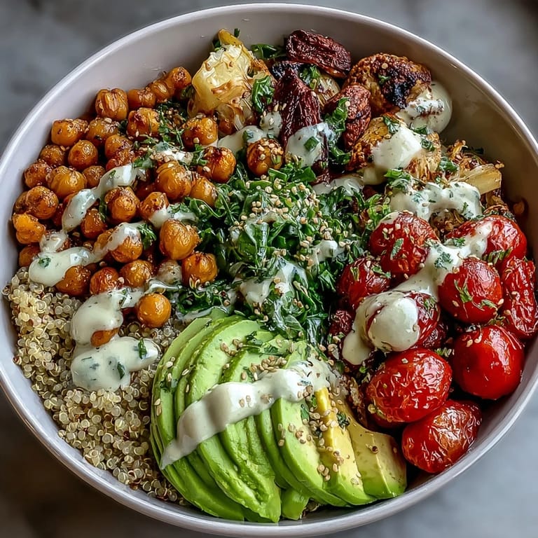 The spiced chickpeas bring savory depth and a hint of smoke that echoes the sweetness of the roasted vegetables. The tahini sauce acts as a cooling, creamy bridge that brings every element into harmony without overwhelming anything. The fresh toppings—avocado, tomatoes, herbs—add brightness and texture that keep your mouth engaged with every bite instead of falling into that heavy, one-note feeling you get from some grain bowls.