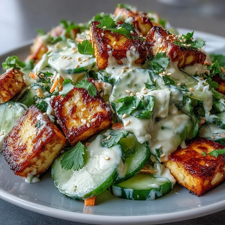 Save to Pinterest The first time I tossed cucumbers with a creamy sesame dressing, I was skeptical about the texture holding up. My friend had just returned from Tokyo and insisted that salting the vegetables first was non-negotiable. I watched the cucumbers weep their water into the colander, and when I finally dressed them, they stayed crisp for hours. The tofu, golden and crunchy from the hot skillet, turned what could have been a simple side into something I craved on repeat.