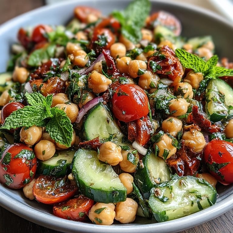 Save to Pinterest Summer afternoons at my neighbor's garden inspired this salad—she'd hand me handfuls of fresh mint and cucumber, insisting I take them home. One lazy Tuesday, I tossed them with chickpeas from my pantry and squeezed a lemon over everything, creating something so bright and simple it became my go-to lunch. The magic wasn't in complexity; it was in letting each ingredient shine without fuss. Now I make it constantly, especially when the kitchen feels too hot for anything else.