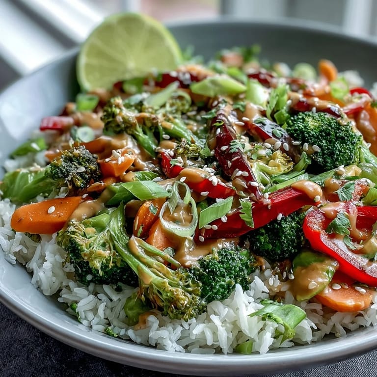 Save to Pinterest One Tuesday evening, my roommate burst through the kitchen door complaining about yet another uninspired dinner, and I found myself pulling vegetables from the crisper drawer with no real plan. Within twenty minutes, this stir-fry was sizzling in the pan, filling the apartment with the most incredible aroma of garlic and ginger. What struck me wasn't just how quickly it came together, but how vibrant everything looked tossed in that silky peanut sauce. She ate three helpings that night and asked me to write down the recipe before she left the kitchen. That's when I realized this wasn't just easy—it was something I'd be making again and again.